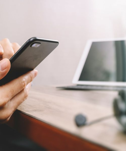 man hand using VOIP headset with digital tablet computer docking keyboard,smart phone,concept communication, it support, call center and customer service help desk on wooden table,filter